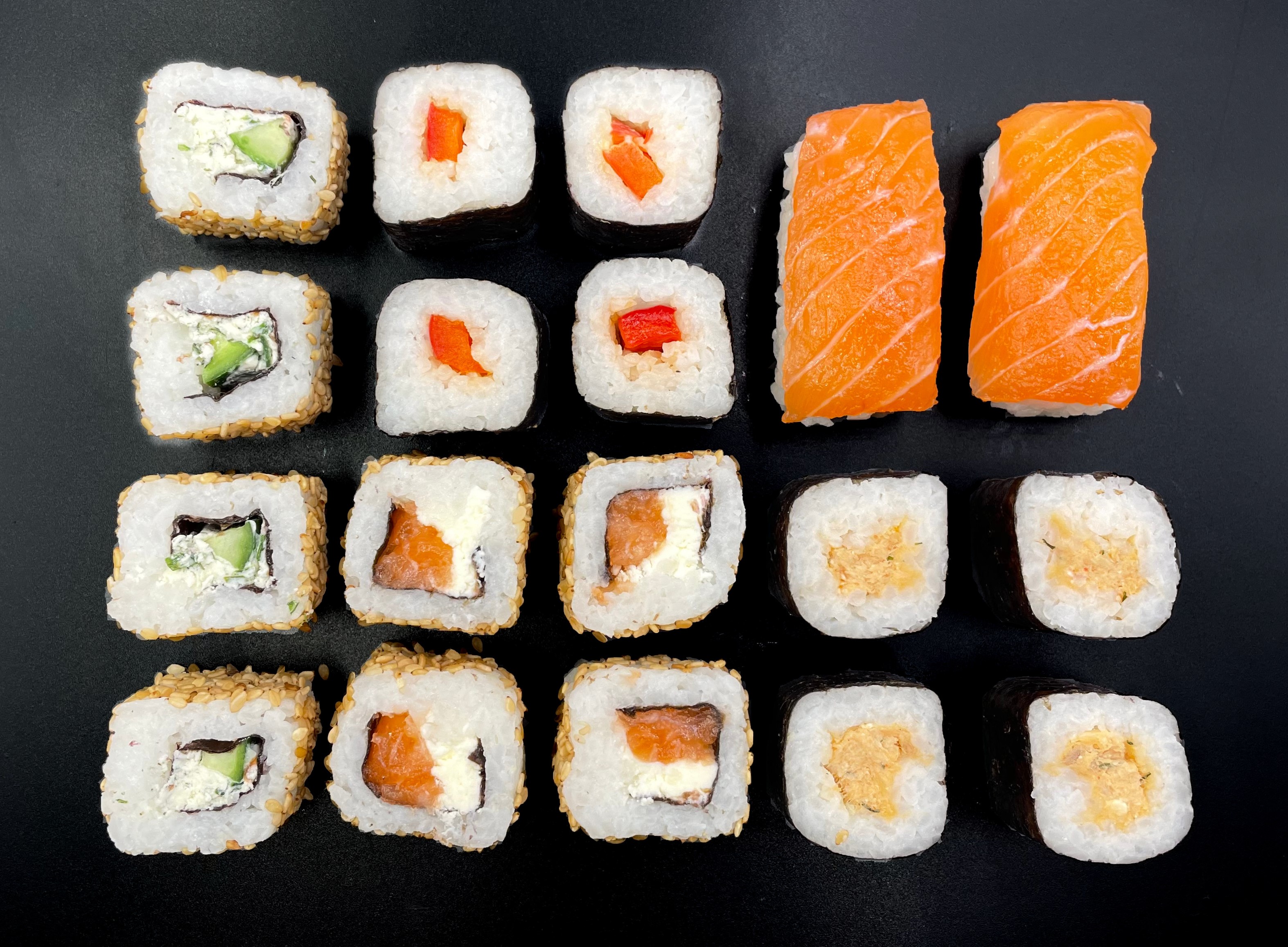 * 2 nigiri saumon* 4 maki poivron rouge* 4 saumon cuit aneth paprika* 4 california saumon fromage * 4 california fromage aux herbes concombre* 1 Sauce soja* 1 Sachet de gingembre * 1 Sachet de wasabi* 1 Pic