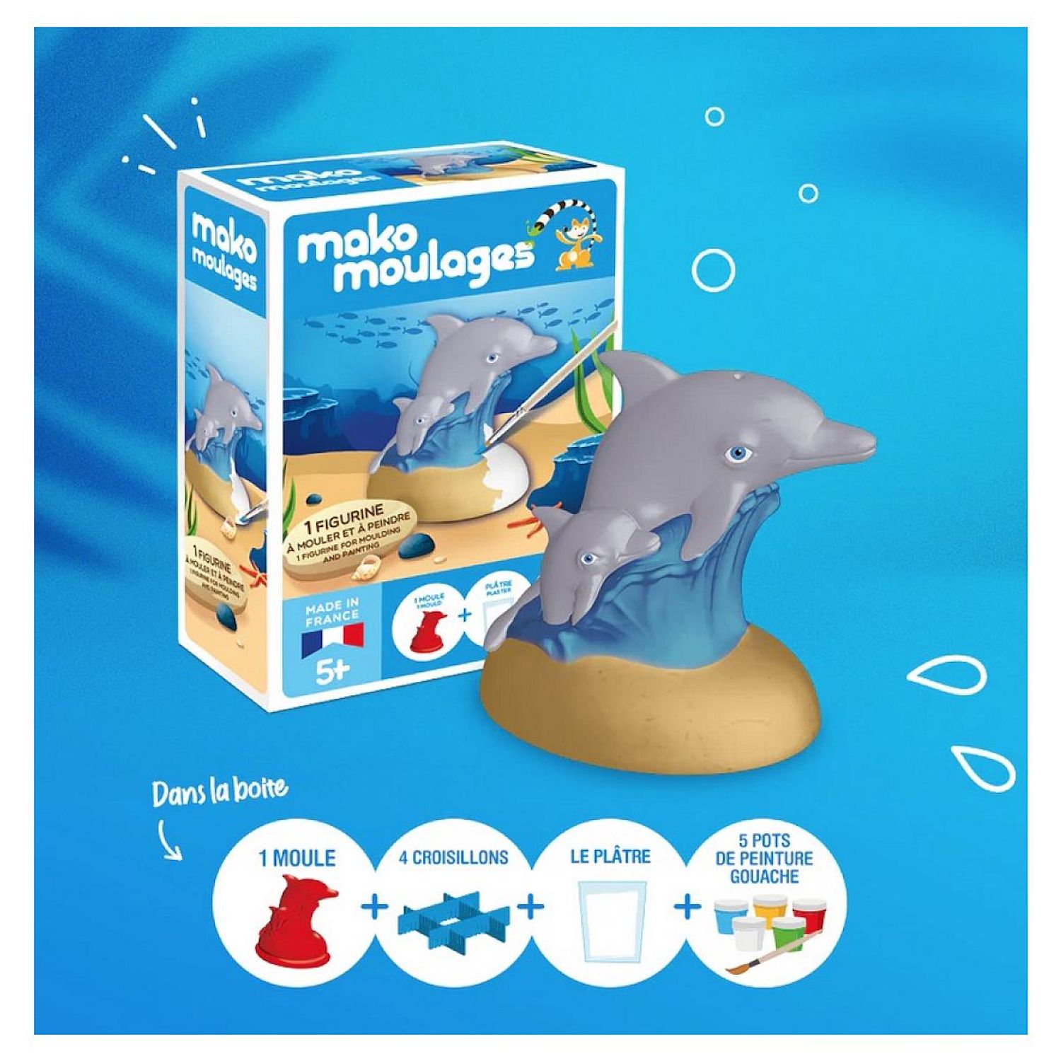 Avec ce nouveau kit unitaire, plongez vos enfants dans le monde aquatique pour apprivoiser et découvrir de près une autre espèce aquatique passionnante : dauphin et son bébé mako moulages ! Après avoir réalisé, leur poisson clown, leur requin ou encore leur tortue de mer grâce au kit créatif mako moulages Cap sur la mer, les enfants pourront compléter leur collection et en apprendre davantage sur la faune marine avec le Dauphin et son bébé !