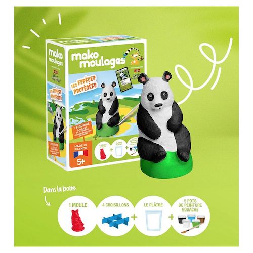 Avec ce kit créatif mako moulages Panda géant, moule et peins cette espèce menacée le panda géant avec de la peinture gouache mako moulages ! Après une sieste bien méritée dans sa forêt, le panda géant s'est remis en marche à la recherche de son prochain repas de bambou ! 1 moule en latex: l'espèce protégée panda géant. 1 sachet de 150g de plâtre,. 4 pots de peinture (blanc irisé, jaune, noir, vert). 4 croisillons. 1 pinceau. 1 notice de jeu. 1 carte Défis Nature de Bioviva