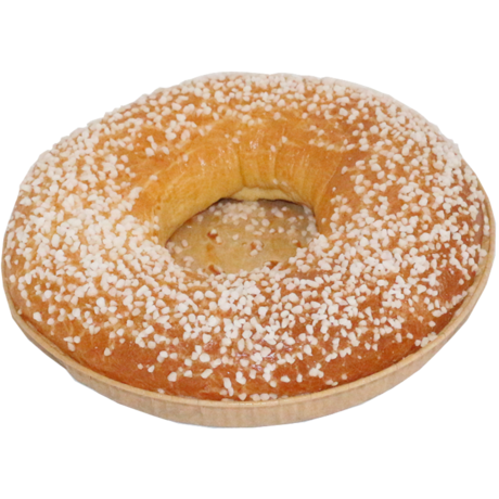 Ingrédients : Farine de BLE (GLUTEN), ŒUFS frais, BEURRE 16,5%, sucre, levain 8,5% (farine de BLE, eau), levure, sel, arôme fleurs d'oranger 0,1%.Décor : sucre grain