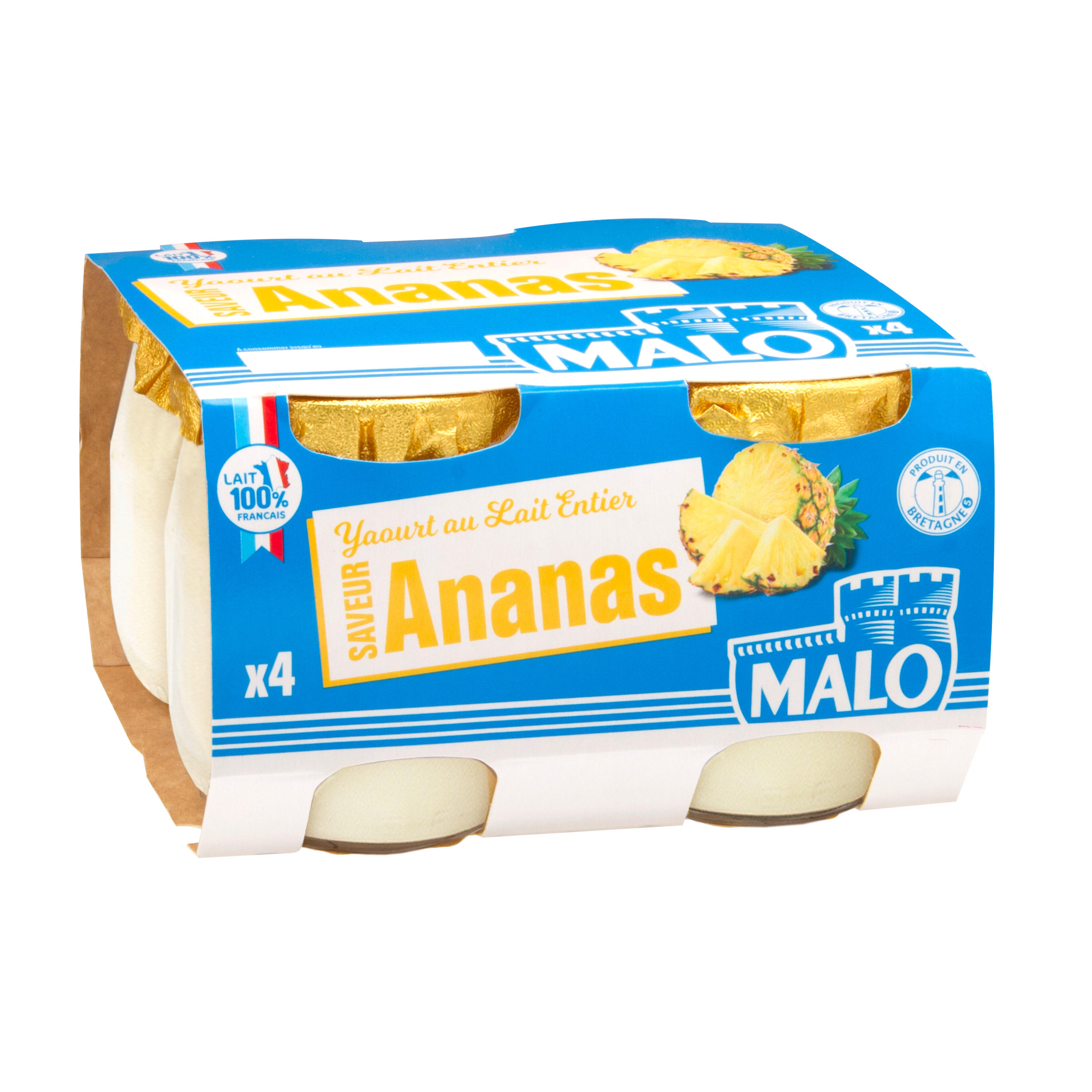 Le Yaourt Ananas MALO, une recette au lait entier de notre collecte. Le goût unique MALO et sa texture onctueuse, décliné en format 4 pots en verre.