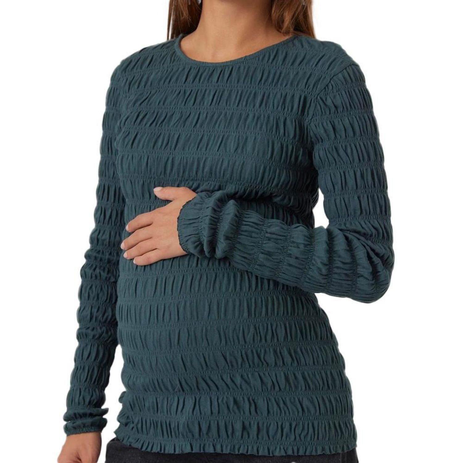 Craquez pour le t-shirt de la marque MAMALICIOUS !- Coloris : Bleu canard- Col rond- Manches longues- Tissu texturé- Composition : 48% Coton 48% Coton recyclé 3% Polyester 1% Élasthanne