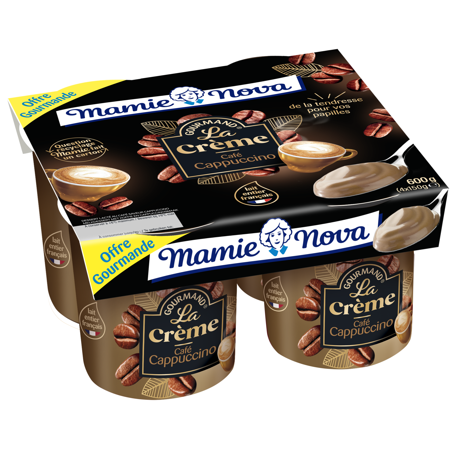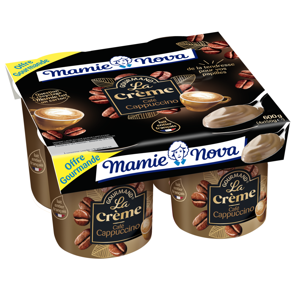 Les amateurs de café apprécieront le Gourmand Crème Café Cappuccino. Une douceur à l'italienne, aux notes de café au lait, élaborée à partir de lait entier et de crème fraîche pour une texture crémeuse, onctueuse et gourmande. Mamie Nova, il n'y a que toi qui me fais ça !