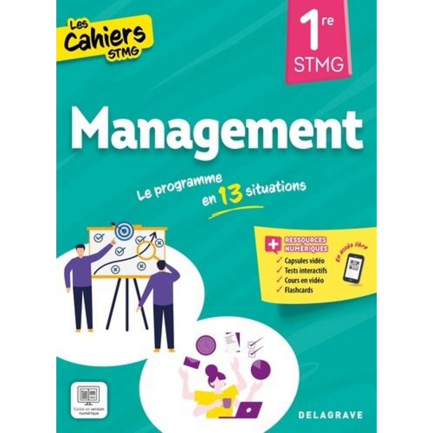Un nouveau cahier TOUT-EN-UN pratique et facile qui révolutionne l'enseignement du management : cours, exercices, méthode, révisions - Une approche concrète conçue à partir de situations réelles qui parlent aux élèves - Une présentation attrayante et visuelle pour donner le goût d'apprendre - Des situations choisies parmi les centres d'intérêt des élèves pour illustrer les notions tout au long du chapitre - 13 chapitres pour couvrir de manière progressive et efficace tout le programme de 1re - 3 objectifs ciblés sur les compétences à acquérir par chapitre et 1 test interactif proposé en fin d'objectif pour valider en autonomie les connaissances au fur et à mesure - Je m'entraîne : des activités ludopédagogiques faciles à mettre en oeuvre et un exercice de synthèse pour remobiliser les notions abordées - Je retiens : des synthèses visuelles et concises pour mémoriser l'essentiel - Vers le Bac : des entraînements pour réussir les évaluations et se préparer progressivement à l'examen - 1 fiche spécialement dédiée à l'épreuve écrite conçue pas à pas pour traiter un sujet de Bac - Méthodo : 4 fiches méthodes simples et guidées en fin d'ouvrage pour apprendre à exploiter les différents types de documents - Des ressources numériques créées pour chaque phase du cours : apprentissage (vidéos, capsules vidéos spécialement créées pour le cahier, cours en vidéo réalisés par les auteurs), entraînement (tests interactifs), révision (flashcards)