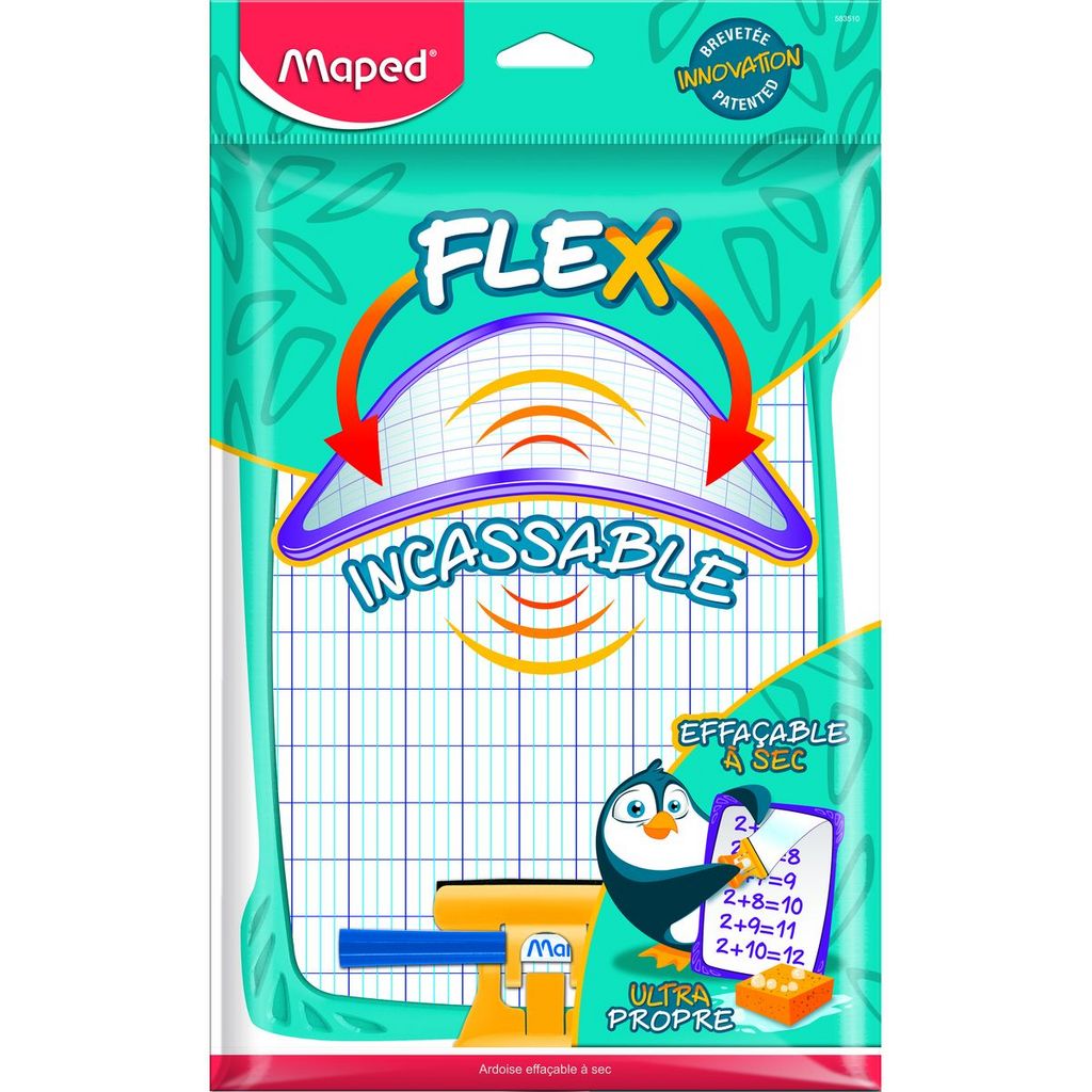 En savoir +Kit ardoise blanche effaçable Flex Incassable avec 1 porte-accessoires, 1 brosse, 1 feutre effaçable à sec. Le porte-accessoires se transforme en support ardoise.