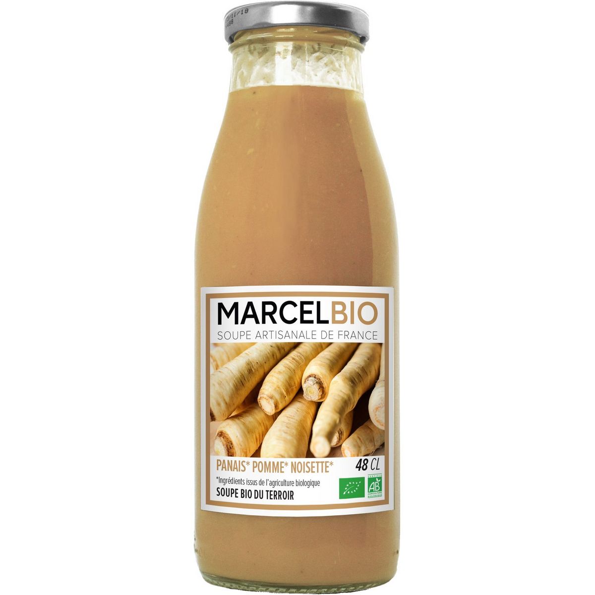 Eau, panais*(30,5%), pomme de terre*, pomme*(4%), poudre de NOISETTE*(2,8%), huile d’olive extra vierge*, ail*, oignon*, sel.