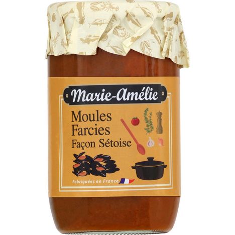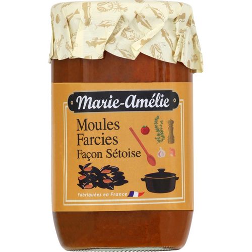 Ingrédients : MOULES farcies (MOLLUSQUES) - 8 à 10 selon taille - Sauce : eau, légumes (poireau, carotte, CELERI, oignon), concentré de tomates, huile de colza, épices, sel, amidon de tapioca, épaississants : gomme de guar et gomme xanthane. Farce : viande de porc (origine : France), eau, gras de porc, sel, sirop de glucose, dextrose, saccharose, persil, plantes aromatiques, arômes naturels, épices, antioxydant : ascorbate de sodium, betterave poudre.