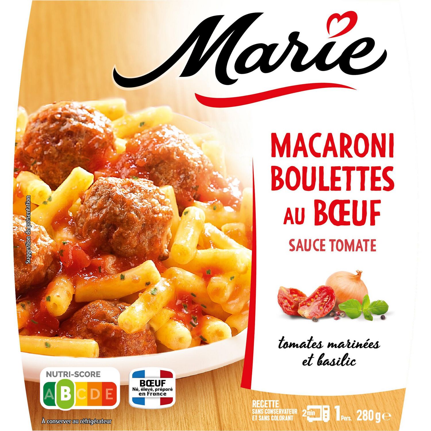 Macaroni boulettes au bœuf sauce tomate, tomates marinées et basilic 280g MARIE