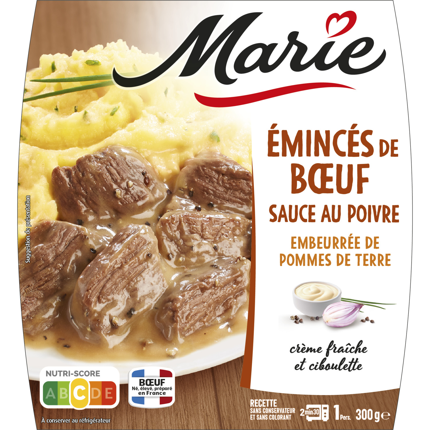 Emincés de bœuf sauce au poivre, embeurrée de pommes de terre, crème fraîche et ciboulette 300g MARIE