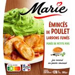 Emincés de poulet, lardons fumés, purée de petits pois