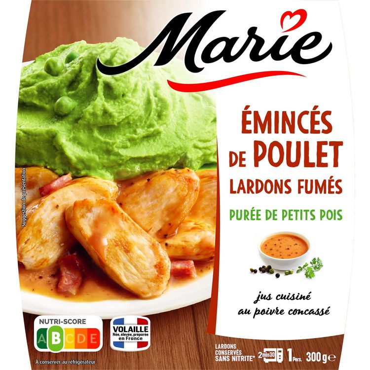 Marie sélectionne de la volaille née, élevée et préparée en France. Marie réalise elle même sa purée dans ses ateliers avec des petits pois, de la crème fraiche, du beurre et des échalotes.