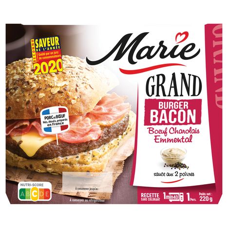 Marie sélectionne des ingrédients de qualité : le steak de ce burger est 100% pur bœuf de race Charolaise garanti origine France par un organisme de contrôle indépendant, le bacon est issu de porc né, élevé, préparé en France.