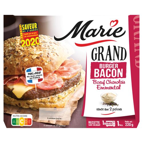 Marie sélectionne des ingrédients de qualité : le steak de ce burger est 100% pur bœuf de race Charolaise garanti origine France par un organisme de contrôle indépendant, le bacon est issu de porc né, élevé, préparé en France. Marie apporte tout son savoir-faire culinaire dans ce burger et cuisine cette sauce avec du poivre vert et du poivre noir.
