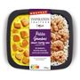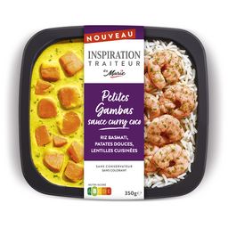 Ingrédients : riz basmati cuit 29,4% (eau, riz basmati), crevettes décortiquées 19,2% (crevettes, eau, sel), eau, patate douce 11,4%, crème fraîche, lentilles vertes cuites 5,3%, huile de colza, échalotes, lait de noix de coco en poudre 1,5% (contient lait), farine de blé, coriandre, épices curry 0,5%, ail, sel, jus de citron concentré, paprika, persil, curcuma, piment fort. Riz basmati et crevettes : origine non-UE. Lentilles cuites : UE et non-UE. Traces possibles de : poisson, mollusques, soja, œuf, céleri et moutarde.