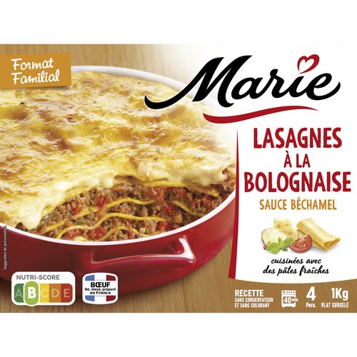 Ingrédients: sauce bolognaise 56,1% [viande de boeuf origine France 12,3%, tomates 9,5% (tomates pelées concassées et jus de tomates), eau, concentré de tomates 7,6%, oignons préfrits 6,8 % (dont huile de tournesol), oignons 3,7%, carottes, CELERI, ail, amidon de maïs, basilic, sel, sucre, fond de boeuf (viande et jus de cuisson de viande de boeuf, sel), laurier, romarin, thym], sauce béchamel 22,5% (eau, CREME fraîche, FROMAGE, amidon de maïs, LAIT écrémé en poudre, farine de BLE, huile de colza, sel, muscade), lasagnes cuites fraîches 19,4% (eau, semoule de BLE dur), FROMAGE 1.9%, paprika.