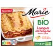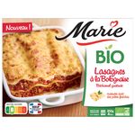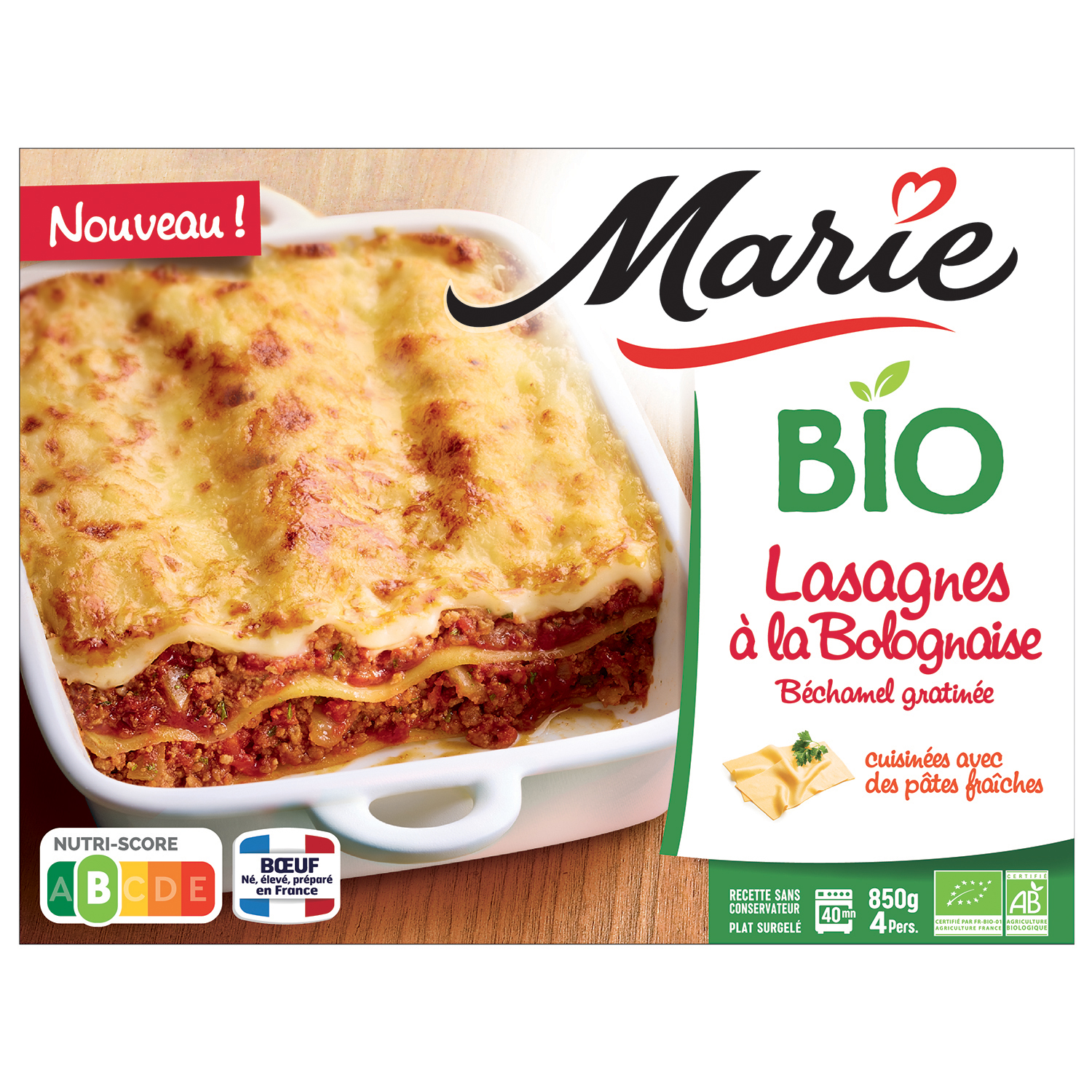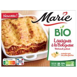 Ingrédients: sauce bolognaise 52,9% [viande de boeuf* origine France 12,2%, oignons* 10,1%, tomates pelées concassées au jus 9% (tomate*, jus de tomate*), eau, concentré de tomates* 7,2%, carottes*, ail*, amidon de maïs, basilic*, sel, sucre de canne*, fond de boeuf (farine de BLE*, sel, graisse* (extrait de romarin, huile de tournesol) et viande de bœuf*, oignon*, tomate*, plante aromatique*, épice*), thym*, origan*, laurier*], pâtes fraîches cuites 22,5% (eau, semoule de BLE dur), sauce béchamel 22,4% (eau, CREME* fraîche, FROMAGE* râpé, amidon de maïs, LAIT* écrémé en poudre, farine de BLE*, huile de colza*, sel, muscade*), FROMAGE* râpé 1,9%, paprika* doux.*ingrédients issus de l'agriculture biologique.Traces possibles de : poisson, crustacés, mollusques, soja, œuf, moutarde, céleri, sésame