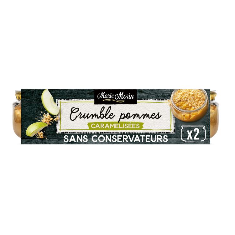 Préparation de pommes origine France caramélisées 81% (compotée de pommes pâtissière 58% (purée de pommes concentrée 47%, sucre), cubes de pommes 34%, caramel 4% (sucre, sirop de glucose, eau), beurre concentré, sel), pâte à crumble 19% (farine de blé, beurre salé, sucre). Traces possibles d’œufs et de fruits à coques. Malgré le soin apporté au tri des fruits, ce crumble peut contenir des pépins.