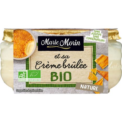 Crème brûlée bio 130G La crème brûlée bio de Marie Morin a tout du célèbre dessert gastronomique français. Elle est préparée avec de la crème fraîche, du lait entier provenant des exploitations voisines, des œufs et du sucre. Pour parfaire la dégustation, saupoudrez uniformément le sachet de sucre de canne sur la crème et passez-la sous le grill du four. Vous obtiendrez une crème brûlée bio croustillante et onctueuse en bouche pour un délicieux dessert comme à la maison. Une crème brûlée onctueuse qui associe savoir-faire et simplicité.