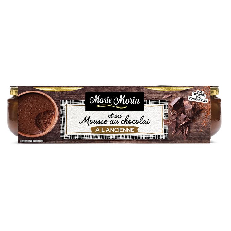 Cette recette de mousse au chocolat à l’ancienne Marie Morin est préparée uniquement avec des ingrédients d’origine naturelle sans colorant ni conservateur : du chocolat 100% pur beurre de cacao, des œufs et du beurre salé.