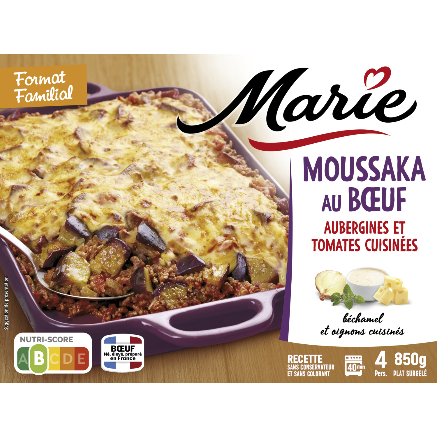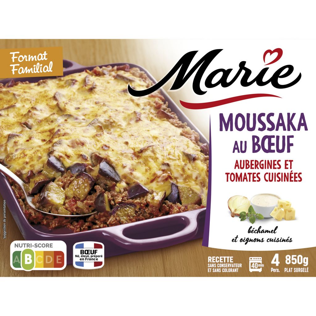 aubergines et tomates cuisinées 54,5% [aubergines préfrites 19,7% (dont huile de tournesol), eau, aubergines grillées 9,2%, purée de tomates 4,5%, tomates 2,3%, concentré de tomates 2,2%, amidon de maïs, oignons, oignons préfrits (dont huile de tournesol), huile de colza, sel, sucre, ail, origan, cumin, poivre], viande de boeuf cuisinée 34,2% [viande de boeuf origine France 15%, purée de tomates 8,9%, eau, oignons, concentré de tomates 1,8%, ail, huile de colza, amidon de maïs, sel, origan, poivre, laurier, thym), sauce béchamel 10% [eau, CREME fraîche, amidon de maïs, FROMAGE, LAIT écrémé en poudre, farine de BLE, huile de colza, sel, muscade], FROMAGE 1,2%.