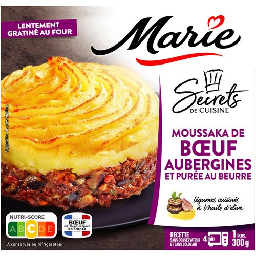 Ingrédients : pommes de terre 30,1%, aubergines grillées 20,2%, viande de boeuf origine France 14%, eau, oignons préfrits (oignons, huile de tournesol), BEURRE concentré 3,5%, CREME fraîche, huile d'olive vierge 2,3%, double concentré de tomates, ail, coriandre, échalotes, vin blanc, menthe douce, fond de veau (bouillon de veau, bouillon de boeuf, sel), LAIT écrémé en poudre, sel, amidon de maïs, cumin, poivre blanc, muscade. Pommes de terre et aubergines : origine UE. Traces possible de : poisson, crustacés, mollusques, œuf, moutarde, soja, céréales contenant du gluten.