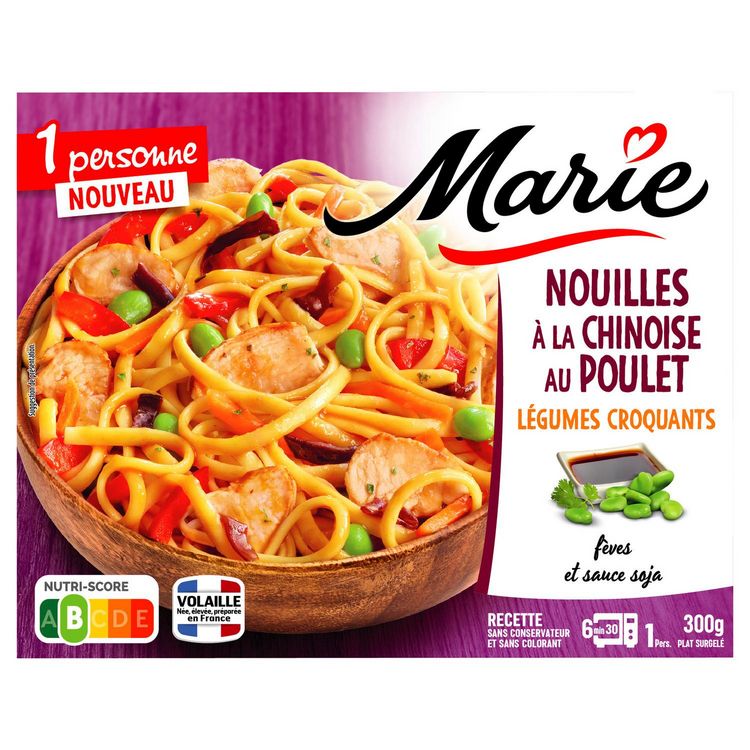 Marie sélectionne des ingrédients de qualité : du poulet né, élevé et préparé en France. Parce qu'on a tous envie d'évasion, Marie cuisine ses nouilles chinoises avec de la sauce soja, du basilic thaï et une touche de gingembre. Marie s'engage : cette recette est cuisinée sans conservateur et sans colorant, pour ne garder que le meilleur des saveurs.