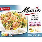 Ingrédients : riz cuit 33% (eau, riz, riz rouge), CREVETTES décortiquées 16,8% (CREVETTES, eau, sel), jus au lait de coco et curry 15,6% [lait de coco 5,3%, CREME fraîche, huile de colza, eau, purée de gingembre, coriandre, huile d'olive vierge, sel, amidon de riz, curry 0,1% (curcuma, coriandre, graine de MOUTARDE, fenugrec, cumin, piment fort), curcuma], carottes jaunes 8,7%, courgettes grillées 8,5%, oignons rouges 6,4%, carottes 4,6%, brocolis 2,6%, eau, huile de colza, sel. Crevette et riz rouge : origine non-UE. Riz : origine UE et non-UE. Traces possibles de : poisson, mollusques, soja, œuf, céleri, sésame, céréales contenant du gluten