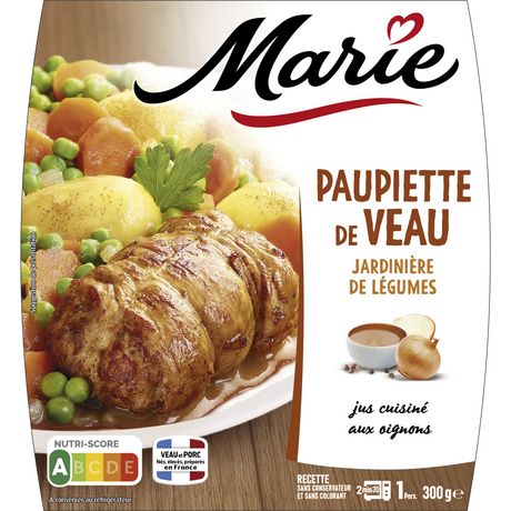 Marie sélectionne une paupiette cuisinée avec du veau et du porc nés, élevés et préparés en France. Marie cuisine soigneusement cette recette avec une compotée d’oignons et une jardinière de légumes. Marie s'engage : cette recette est sans conservate
