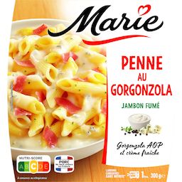 Ingrédients: penne cuites 47,6% (eau, semoule de BLE dur, huile de colza), eau, GORGONZOLA AOP 11,8%,CREME fraîche 11,2%, jambon cuit supérieur fumé 6,6% (jambon de porc origine France, sel, arômes naturels*, antioxydant : acide ascorbique), farine de BLE, huile d'olive vierge, fond de volaille (bouillon de poulet, graisse de poulet, carottes, sel, thym, laurier), origan, purée d'ail, sel, poivre noir fumé, curcuma. *Contient naturellement des polyphénols qui contribuent à la préservation de l'oxydation. Penne : origine Italie. Traces possibles de : poisson, crustacés, mollusques, œuf, céleri, moutarde, soja.