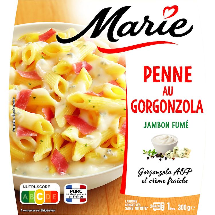 Marie sélectionne du Gorgonzola AOP ainsi que de la viande de porc né, élevé et préparé en France ;