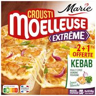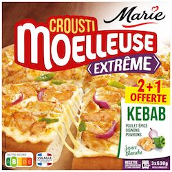 Ingrédients: Pâte 49,8% (farine de BLE 30% (origine France), eau, huile de colza, levure boulangère, sel, sucre), émincés de viande de cuisse de poulet mariné kebab cuit 14,7% (viande de poulet origine France 14%, épices et plantes aromatiques, sel, sucre), MOZZARELLA 13,9%, sauce blanche 13,2% [eau, FROMAGE blanc 3,4%, oignons 2,2%, amidon de maïs, sel, jus de citron, menthe douce, double concentré de tomates, épices et plantes aromatiques, purée d'ail, purée de piments (piments, sel)], oignons rouges 4,3%, poivrons verts 3,7%, paprika. Traces possibles de : poisson, crustacés, mollusques, œuf, moutarde, céleri