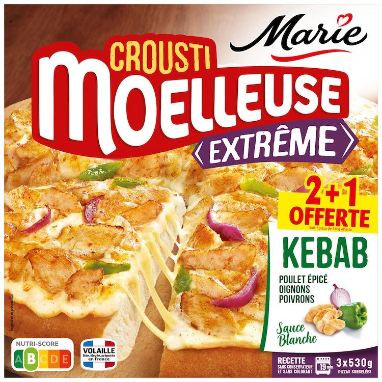 Marie sélectionne des ingrédients de qualité : de la farine 100% origine France et de la volaille née, élevée et préparée en France. La pâte à pain est pétrie dans nos ateliers le jour-même. Et parce qu'une bonne pizza c'est aussi une sauce qui a du goût, notre sauce blanche est cuisinée par notre chef. Marie s'engage : nous l'avons cuisinée sans additif pour avoir la recette la plus simple et savoureuse possible.
