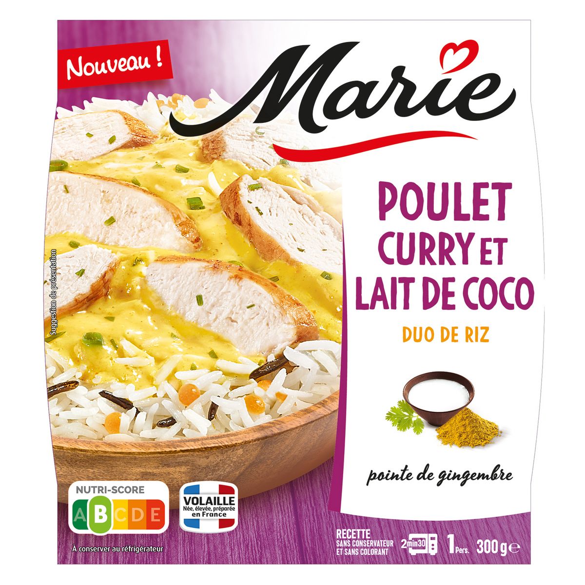 Marie sélectionne du poulet né, élevé et préparé en France. Parce que l'on a tous envie d'évasion, Marie cuisine sa sauce avec du curry, du lait de coco et une pointe de gingembre pour une explosion de saveurs en bouche. Marie s'engage : cette recette est sans additif, pour ne garder que le meilleur des saveurs.