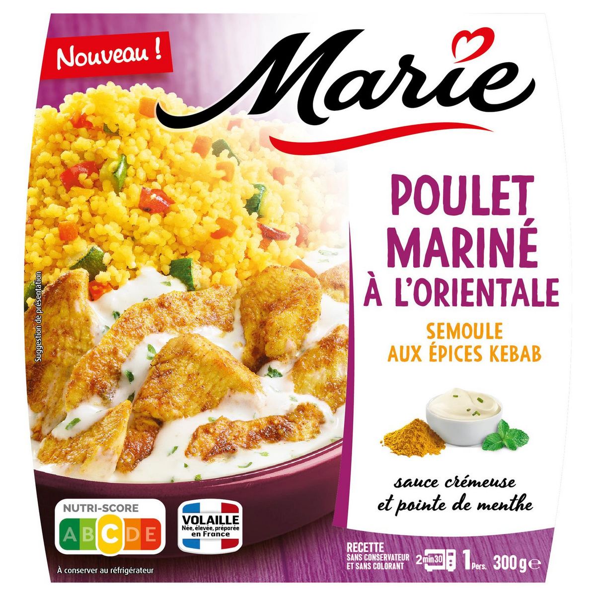 Marie sélectionne du poulet né, élevé et préparé en France . Parce que l'on a tous envie d'évasion, Marie cuisine sa semoule et marine son poulet avec des épices orientales. Le tout, accompagné d'une onctueuse sauce relevée d'une pointe de menthe pour réveiller les papilles. Marie s'engage : cette recette est sans additif, pour ne garder que le meilleur des saveurs.