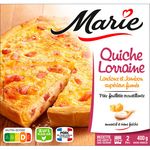 Ingrédients : Pourcentages exprimés sur le total de la recetteGarniture 65,2% OEUFS de poules élevées en plein air 14,6%, CREME fraîche 11,6%, eau, lardons cuits fumés 10,2% (poitrine de porc origine France, eau, sirop de glucose, sel, arômes naturels, aromates, ferments), EMMENTAL 10,2%, jambon supérieur fumé 5,6% [jambon de porc origine France, eau, sel, sirop de glucose, arômes naturels, bouillon de légumes (blettes, carottes), ferments], farine de BLE, amidon de mais, sel, muscade, poivre, curcuma.Pâte feuilletée 34,8% farine de BLE française, eau, huiles végétales 5,9% (palme, colza), sel, levure désactivée.Traces possibles de : poisson, crustacés, mollusques, moutarde, céleri