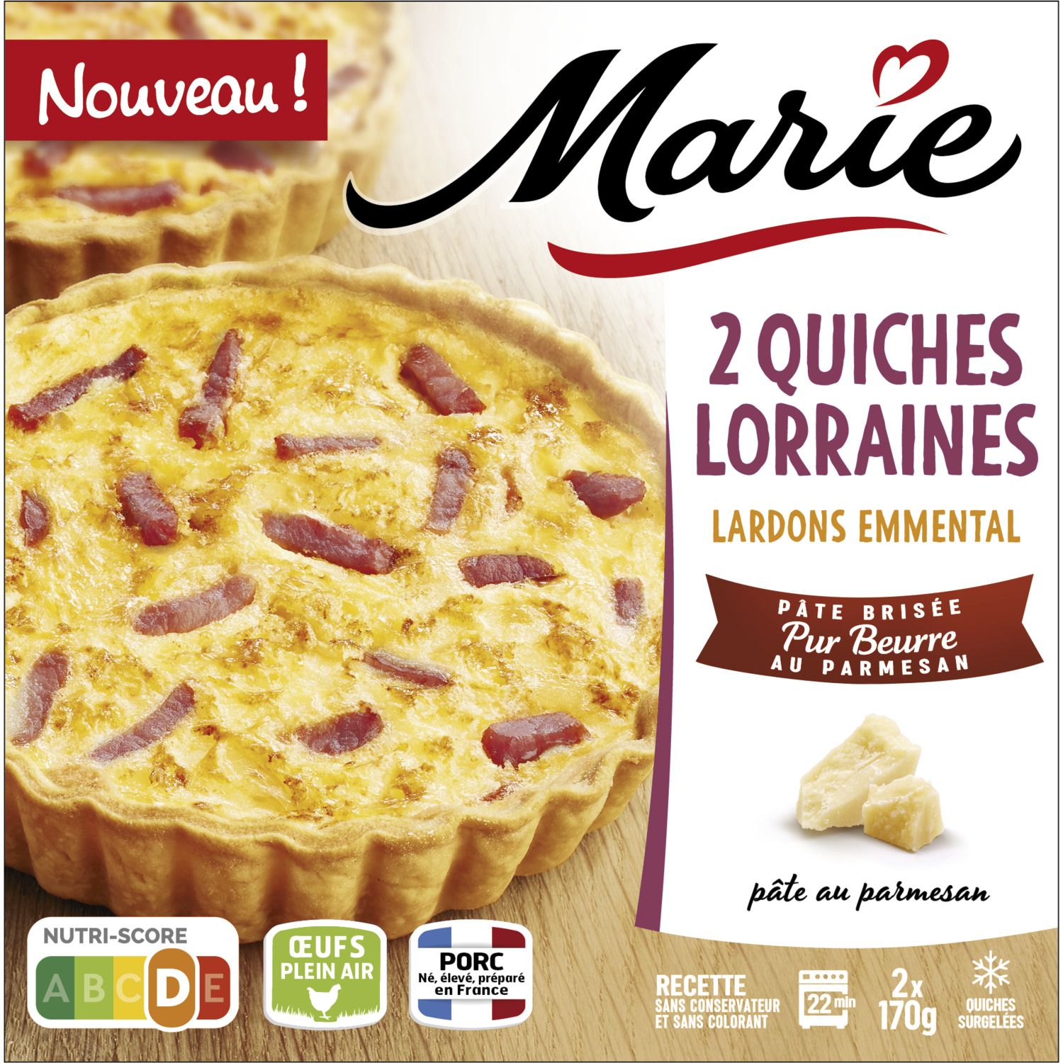 Marie sélectionne des ingrédients de qualité : des œufs pondus en France par des poules élevées en plein air, des charcuteries conservés sans nitrite, du porc né, élevé, préparé en France et de la farine 100% origine France. Parce que les tartes sont au cœur de notre savoir-faire, la pâte brisée pur beurre, dorée et au bon goût de parmesan, est fabriquée dans nos ateliers et utilisée le jour-même !