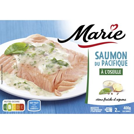 SAUMON ATLANTIQUE MARIE SAUCE OSEILLE avec de la crème fraîche et des oignons Parce que bien cuisiner demande de l'exigence, Marie s'engage chaque jour à vous apporter le meilleur. Pour vous, Marie sélectionne ses ingrédients avec soin, les cuisine simplement sans ajouter d'additif et apporte sa touche personnelles pour des recettes hautes en couleur et en saveur.