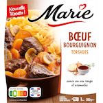 Ingrédients: torsades cuites 36,8% (eau, semoule de BLE dur, huile de colza), viande de boeuf origine France VBF 25%, eau, carottes 6,4%, vin rouge 5,2%, champignons de Paris 4,2%, lardons fumés cuits 3,3% (poitrine de porc origine France, sel, arômes naturels**, antioxydant : acide ascorbique), oignons 2,3%, farine de BLE, bouillon de légumes [légumes et jus de cuisson de légumes (tomates, oignons, poivrons, aubergines grillées, ail, courgettes), huile d'olive vierge, sel, poivre], fond de boeuf [viande et jus de cuisson de viande de boeuf (origine : UE et non-UE), sel], double concentré de tomates, BEURRE, sel, ail, thym, poivre blanc, laurier **Contient naturellement des polyphénols qui contribuent à la préservation de l'oxydation Torsades : origine France, Italie. Vin rouge : origine UE. Traces possibles de : poisson, crustacés, mollusques, oeufs, soja, moutarde, céleri