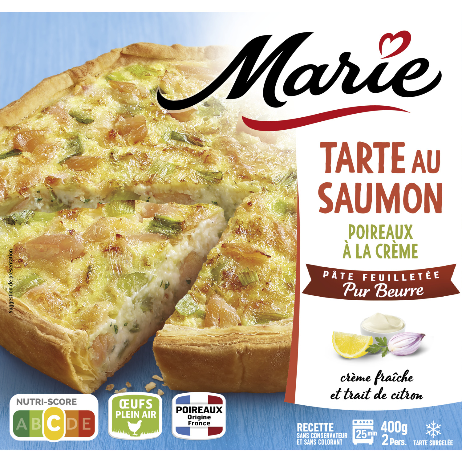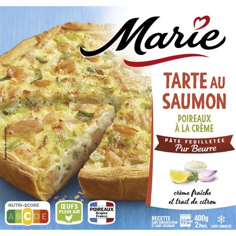 Ingrédients : Garniture 66,3% : SAUMON ATLANTIQUE 12,6%, eau, poireaux 11,7%, OEUFS de poules élevées en plein air 10,5%, CREME fraîche 7,9%, FROMAGE blanc, amidon de maïs, farine de BLE, jus de citron 0,9%, vermouth, SAUMON fumé 0,4% (SAUMON, sel), sel, persil, échalotes 0.2%, poivre. Pâte feuilletée 33,7% : farine de BLE française 20%, eau, BEURRE 4,7%, sel, levure désactivée. Saumon : origine UE et non-UE. Traces possibles de : crustacés, mollusques, moutarde, céleri