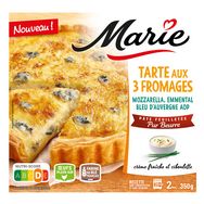Marie sélectionne des œufs pondus en France par des poules élevées en plein air. Marie pétrit sa pâte feuilletées Pur Beurre en France. Marie exige le meilleur avec une recette avec de la Mozzarella, de l'Emmental et du Bleu d'Auvergne certifié AOP le tout cuisiné avec de la crème fraîche et de la ciboulette.