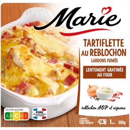 Marie sélectionne de la viande de porc né, élevé et préparé en France. Parce que le gratinage est le savoir-faire de Marie, des tranches de Reblochon AOPsont déposées sur la tartiflette qui est ensuite lentement gratinée au four.