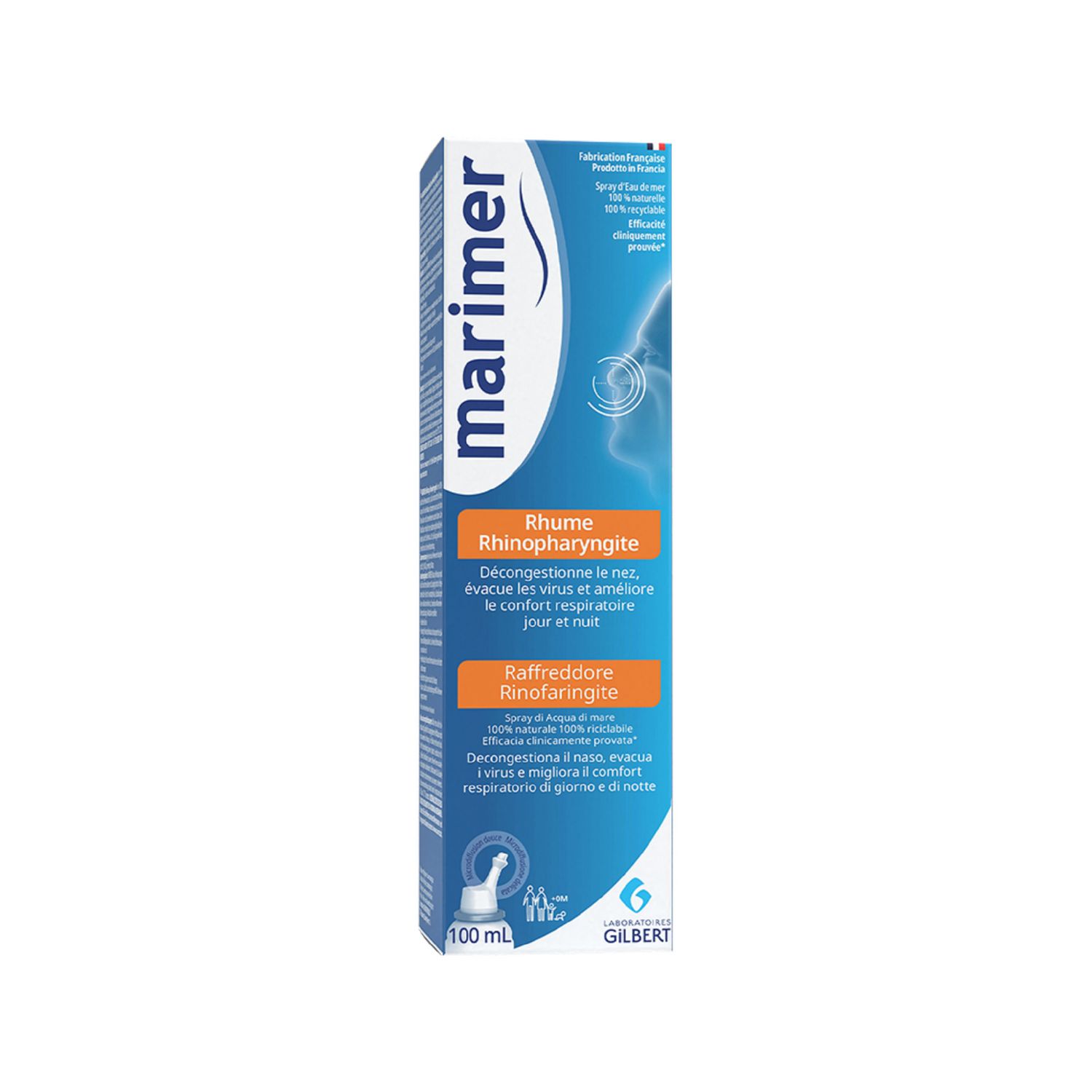 MARIMER Rhume Rhinopharyngite est un spray d'eau de mer 100% naturelle puisée dans le Parc naturel marin d'Iroise, riche en sels minéraux et oligo-éléments marins. Il décongestionne le nez et facilite l'évacuation des sécrétions nasales grâce à sa concentration hypertonique (22‰). Sa micro-diffusion permet une application douce et homogène sur la muqueuse. Son embout assure une administration facile et en toute sécurité. Sa valve anti-retour est conçue pour éviter tout risque de contamination extérieure et assure la protection de la solution. Le spray MARIMER Rhume Rhinopharyngite est conseillé chez les adultes, enfants et nourrissons dès la naissance (hors prématurés) en cas de rhume, rhinopharyngite, rhinite et rhino-sinusite aigue : • Il décongestionne le nez • Il nettoie la muqueuse nasale et évacue les virus, bactéries et allergènes contenus dans les sécrétions • Il fluidifie les sécrétions nasales et facilite leurs éliminations • Il améliore le confort respiratoire jour et nuit • Il s'utilise en complément des traitements des infections ORL