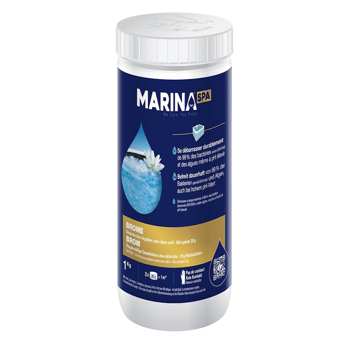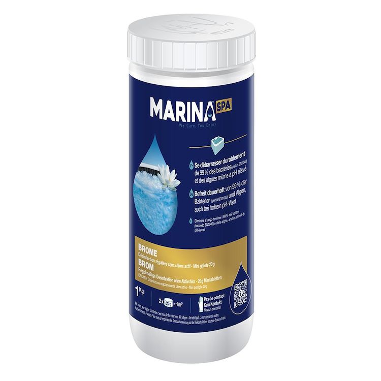 Brome en galets pour spa 1 kg - Marina SpaExcellente activité désinfectante, quel que soit le pH de l'eau traitée (98% à pH 7,0 et encore 75% à pH 8,2)Allège voire supprime le contrôle du pHProduit > donc sans production de dérivés gênants (chloramines, stabilisant)Émanations gazeuses très réduites