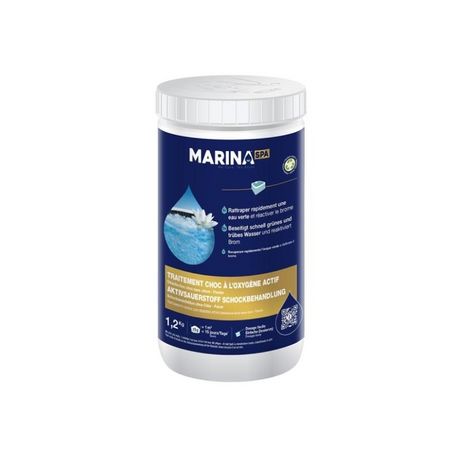 Choc en poudre sans chlore pour spa 1,2 kg - Marina SpaTraitement choc à l'oxygène actif sans chlore en poudre pour renforcer l'efficacité des mini galets au brome Marina.Désinfectez l'eau de votre spa avec ce traitement choc à l'oxygène actif. Il permet d'assainir l'eau de votre spa, de rattraper u