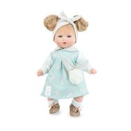 Rencontrez la petite Bunny, une adorable poupée de 40 cm qui charmera tous ceux qui croiseront son chemin ! Parée d'une robe bleu ciel ornée de petits lapins joyeux, elle est équipée d'un bandeau assorti et d'un foulard douillet pour compléter son look hivernal. Avec ses deux petites couettes blond