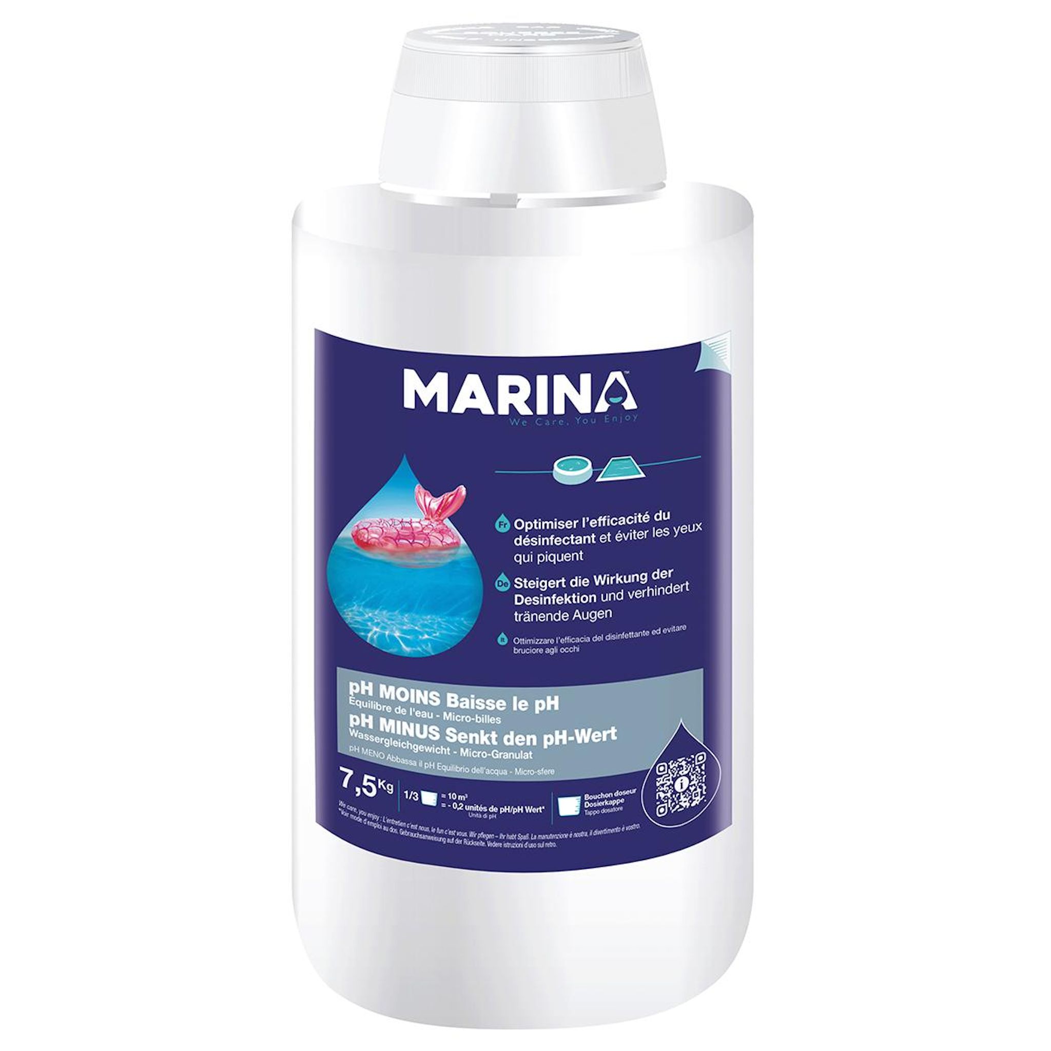 Marina 888242 Pour un confort de baignade optimal, il est nécessaire d'avoir un bon réglage du pH. Celui-ci facilite l'action de tous les produits de traitement. Il est conseillé de contrôler l'eau de votre piscine une fois par semaine et avant la baignade grâce à une trousse d'analyse Marina, le pH
