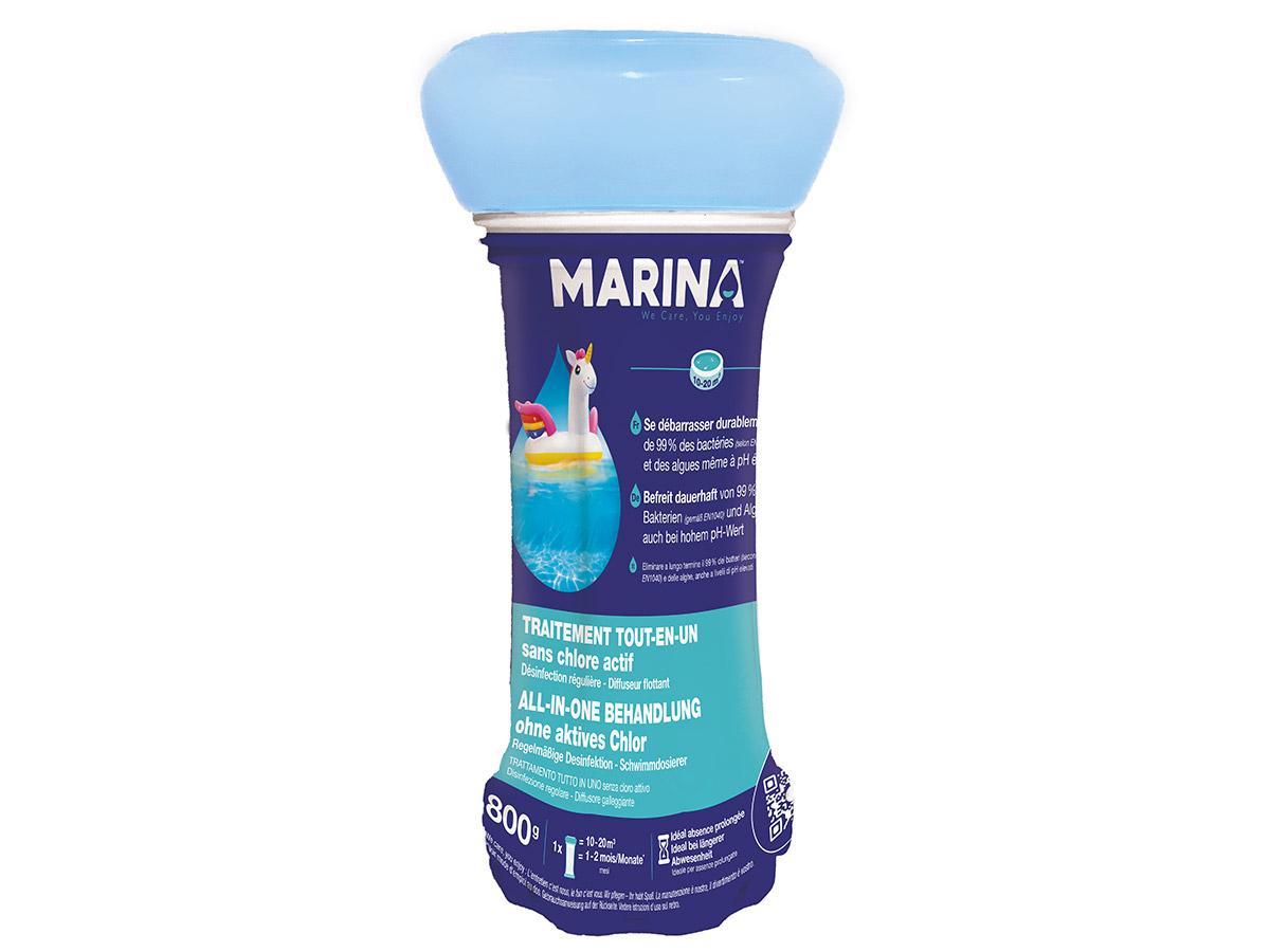 Traitement tout-en-un sans chlore en diffuseur flottant pour 10 à 20 m³ - MarinaTout en un seul geste :Désinfectant longue duréeLutte contre les alguesExcellente activité désinfectante, quel que soit le pH de l'eau traitéeAllège voire supprime le contrôle du pHProduit > donc sans production de dériv