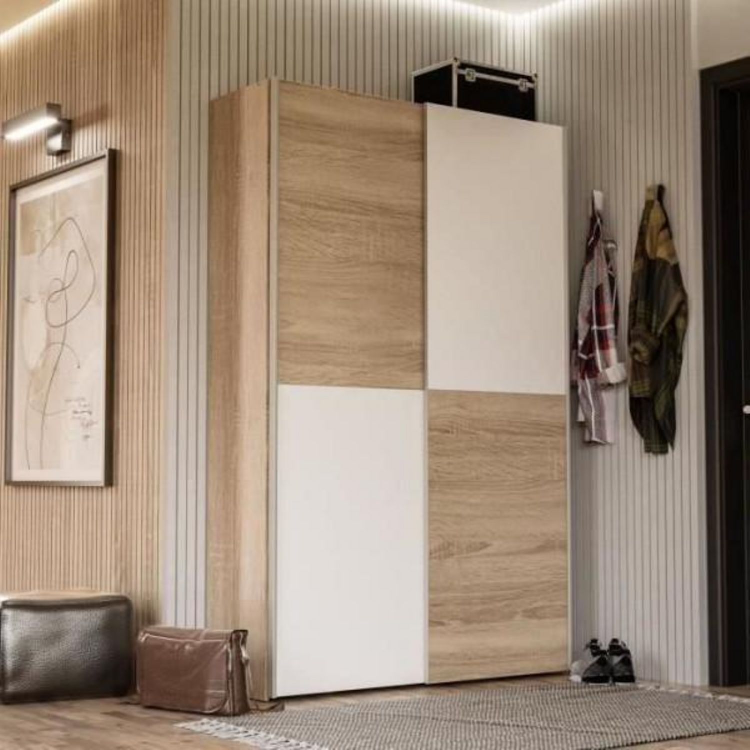 Armoire 2 portes coulissantes multifonction - Blanc et chene clair - L 120 x P 41,6 x H 190,5 cm - OZZULA