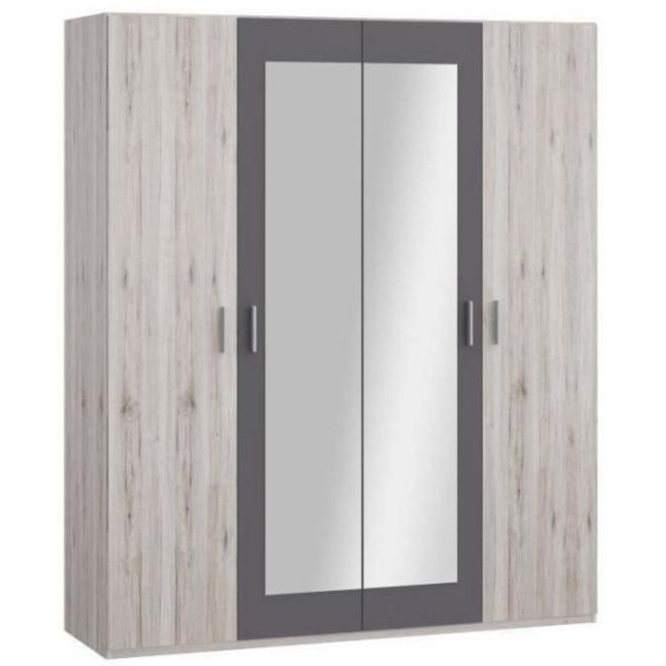 Armoire de chambre - ADRIA - Décor Chene cendré / Gris foncé - 4 portes battantes - 2 miroirs - L177,5 x P54,2 x H210,5 cm