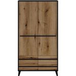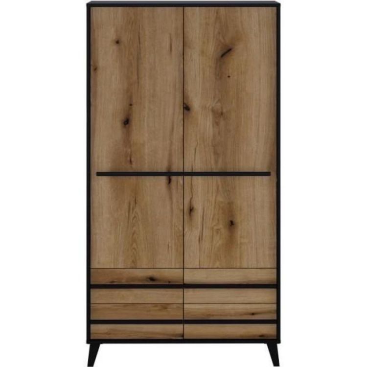 Armoire de chambre HEKA 180cm hauteur. Fabriqué en mélamine noire pour le contour du meuble et en mélamine chene rustique pour les portes et façades tiroirs. 2 Portes + 4 tiroirs. Poignées et pieds en noir.